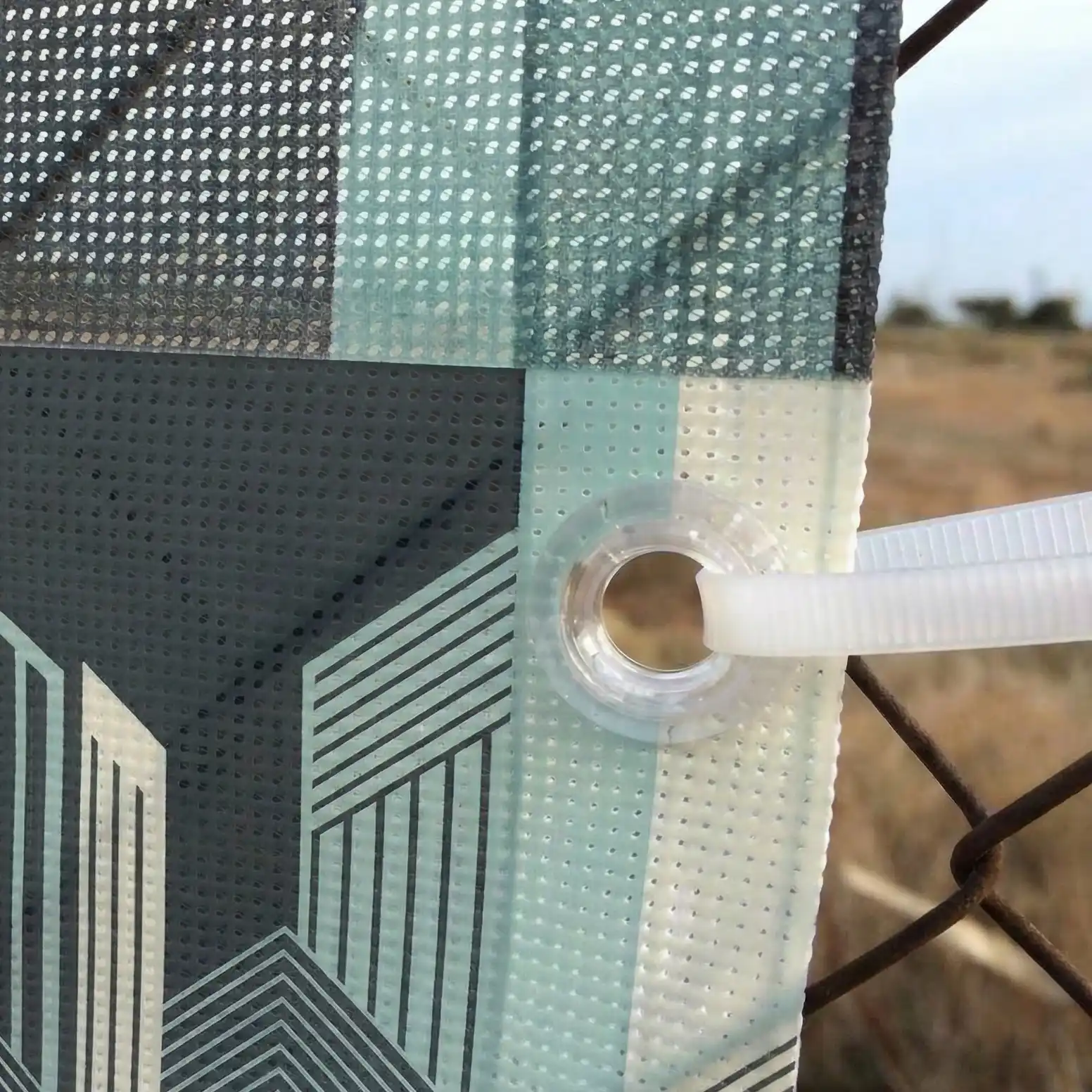 Refuerzo Perimetral Obligatorio: En lonas de red/mesh, la tensión se distribuye de manera diferente. Por eso, aplicamos un doble pliegue termosellado en todo el perímetro para dotar de una resistencia extra a los puntos de anclaje.