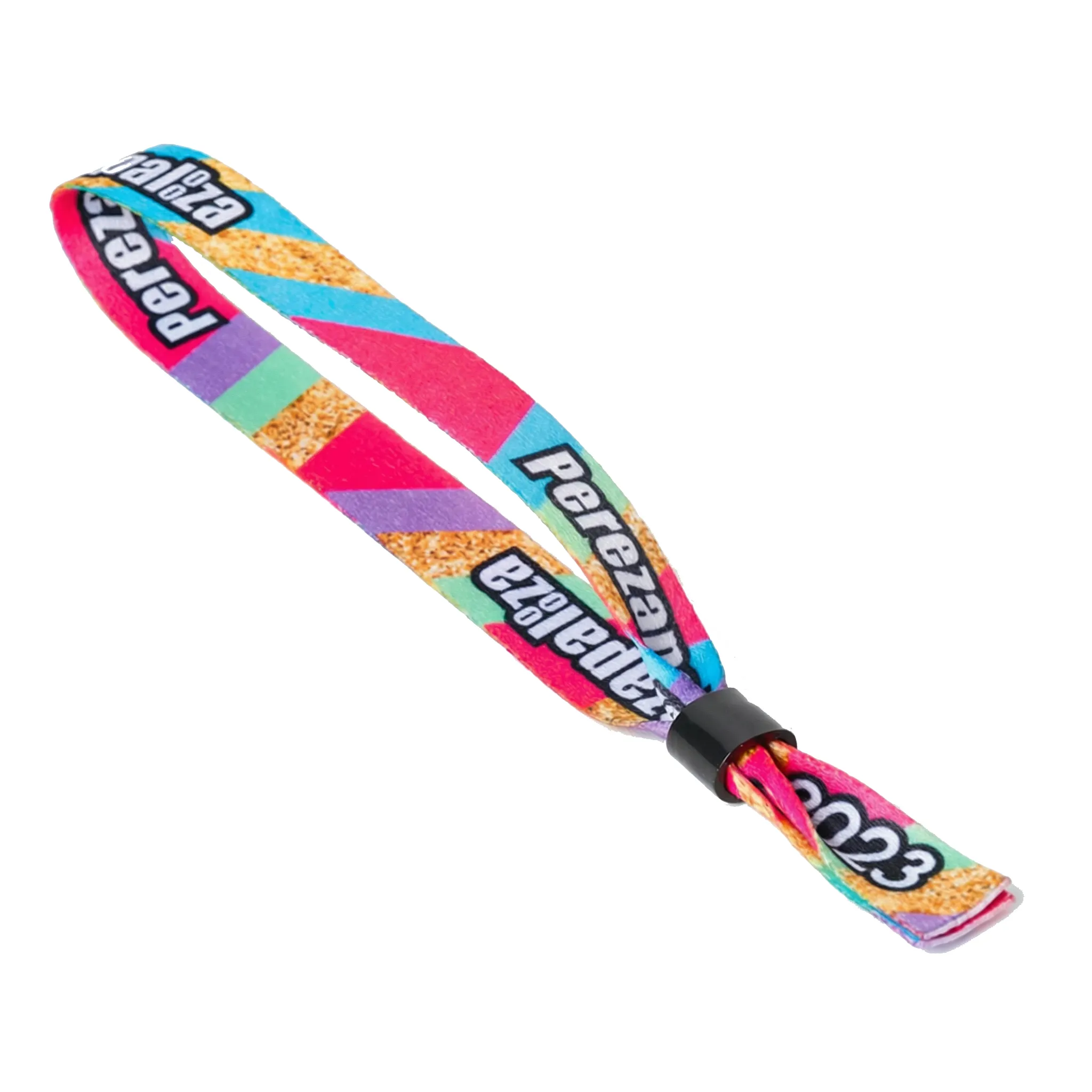 Pulseras de tela bordadas: Para aquellos que buscan una opción más premium, las pulseras bordadas son la elección perfecta. En este caso, el diseño se teje directamente en la pulsera, proporcionando un acabado más elegante y resistente. Este tipo de brazalete no solo asegura el control de acceso, sino que también se convierte en un recuerdo valioso para los asistentes.